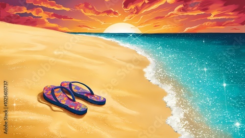 watercolor painting of flip-flops on a sandy beach