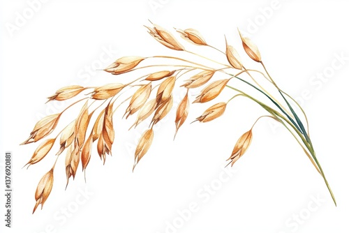 watercolor, painting, oat, sprig, botanical, illustration, autumn, harvest, nature, cereal, grain, plant, organic, agriculture, farm, fresh, food, healthy, diet, ingredient, gold, yellow, brown, green, leaf, stem, ripe, seed, floral, artistic, artwork, design, element, image, picture, photo, natural, eco, rustic, vintage, background, texture, pattern, isolated, white, tree branch, drawing