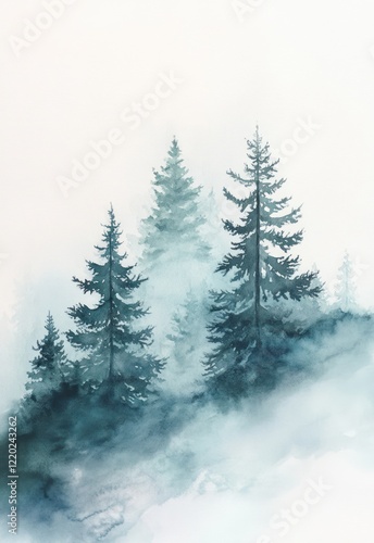 watercolor, painting, tree, forest, evergreen, misty, fog, landscape, nature, art, winter, serene, calm, peaceful, tranquil, quiet, still, majestic, tall, dark, green, blue, teal, shades, hue, tone, colours, texture, background, image, picture, artwork, scenic, view, aethereal, mystical, atmosphere, mood, ambience, soft, delicate