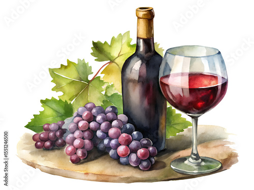 red wine, wine bottle, wine glass, grape, still life, illustration, beverage, alcohol, drink, food and drink, vinery, vinification, red grapes, wine tasting, wine cellar, delicious, refreshment, celebration, romantic, elegant, rustic, vintage, autumn, harvest, fruit, epicure, sommelier, wine bar, eatery, picnic, dinner, party, holiday, lifestyle, food photography, artistic, creative, painted, art, design, composition, natural, organic, wooden board