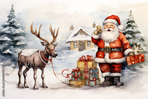 animal, art, artwork, background, box, cartoon, celebration, christmas, claus, cold, colourful, cute, december, cervid, design, drawing, eve, fantasy, festival, festive, gift, giving, graphic, greeting, happiness, happy, holiday, ink, joy, merry, new, old, painting, present, red, reindeer, santa, season, sky, smile, snowfall, snowflake, traditional, tree, vintage, watercolor, white, winter, christmas
