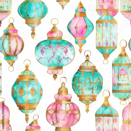 watercolor, pink, turquoise, gold, moroccan, lantern, pattern, white background, art, design, decoration, decorative, illustration, hand-painted, ethnic, traditional, culture, ornament, bohemian, exotic, vintage, retro, arabic, middle eastern, colourful, vibrant, bright, decor, textile, fabric, print, wallpaper, home decor, interior design, craft, hand-made, stylish, chic, fashionable, trendy, aglow, detailed, elegant, delicate, intricate, oriental