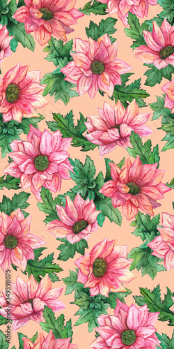 Watercolor pink chrysanthemum flowers green leaves seamless pattern texture background