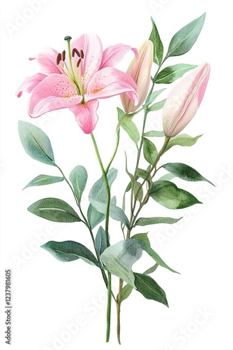 Watercolor Pink Lily Flower Bouquet with Green Leaves