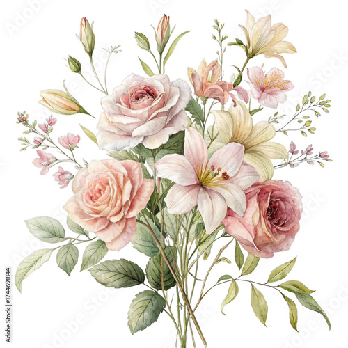 watercolor, pink, rose, lily, floral, bouquet, flower, delicate, soft, pastel, arrangement, bloom, blossom, garden, nature, botanical, greenery, leaf, stem, artistic, painted, illustration, vintage, romantic, elegant, gentle, fresh, beauty, spring, summer, celebration, wedding, greeting, card, design, element, decorative, art, drawing, hand, drawn, creative, pattern