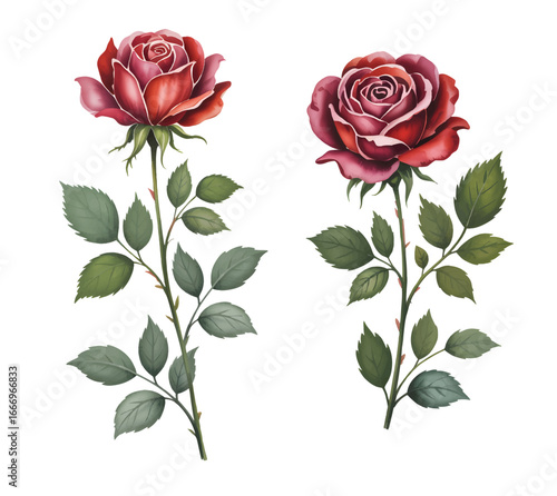 rose, flower, bloom, blossom, bud, leaf, foliage, stem, thorn, red, pink, romantic, love, botanical, floral, garden, nature, spring, summer, wedding, bouquet, arrangement, fresh, natural, soft, pastel, elegance, beauty, isolated, watercolor, painted, hand-made, illustration, art, drawing, flora, decorative, plant, red rose, hand-painted, garden flower