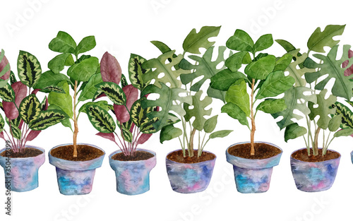 Watercolor seamless hand drawn horizontal border potted indoor flowers. Monstera ficus fiddle leaf tree prayer plant calathea. Green foliage grey pink soft pastel violet pots interior design urban