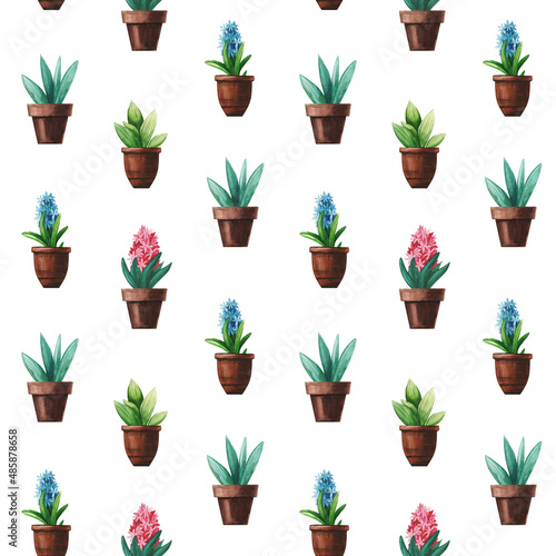 Watercolor seamless pattern with spring flowers in pots. Pink and blue hyacinths.