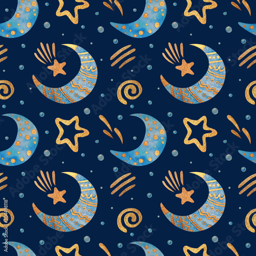 Watercolor seamless pattern with the moon, stars, and clouds. Gold watercolor on the dark background. Kids watercolor night illustration. Ideal for children's textiles, greeting cards, posters, backdr