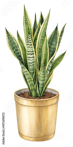 watercolor, snake, plant, gold, pot, isolated, transparent, background, indoor, house, decor, ornamental, lush, foliage, green, leaf, home, living, room, office, air, purifier, clean, minimal, modern, stylish, elegant, graceful, beautiful, aesthetic, charme, delicate