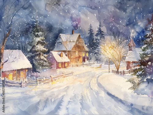 Watercolor Snowy Village at Night