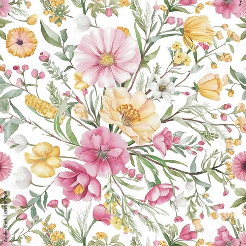 Watercolor spring floral bouquets, branches and leaves seamless pattern, hand painted on a white background