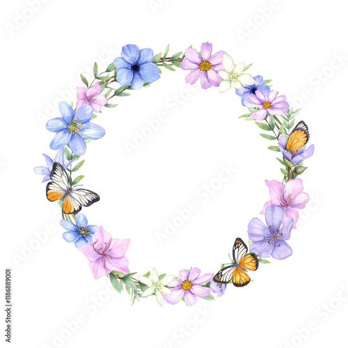 Watercolor spring flowers, eucalyptus branches, white orange butterflies wreath. Blue anemone, liverwort, pink cosmos flower frame for Valentine day cards, invitation design, stationery. Empty space