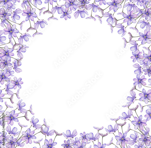 floral, flower, watercolor, green, nature, forest, scilla, coppice, anemone, plant, spring, blue, blossom, season, botany, blooming, leaf, bluebell, tree branch, glade, greeting, drawing, art, illustration, isolated, white, painting, purple, violet, card, summer, hepatica, springtime, lilac, birthday, realistic, romantic, ribbon, bow, branch, frame, border, invitation, chaplet
