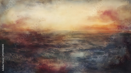 Watercolor stains cover the art board, creating a textured, multi-layered surface. The colors shift from light pastels to deep,