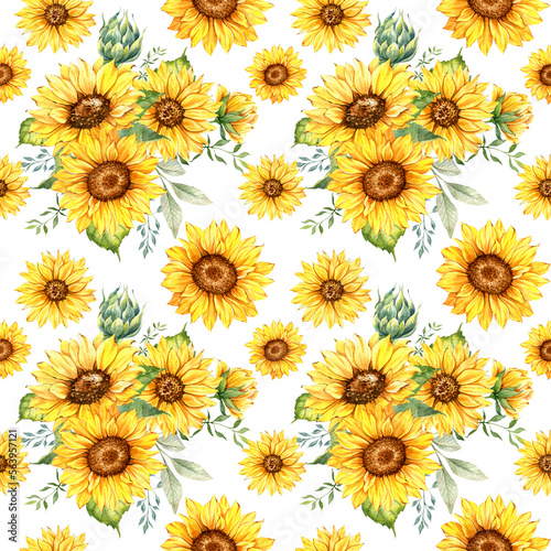 Watercolor Sunflower Background, Sunflower Seamless pattern with Hand Painted Watercolor Sunflowers and Greenery on white background