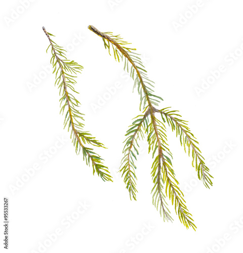 Watercolor Twigs of evergreen fir on white. Hand drawn pine branch