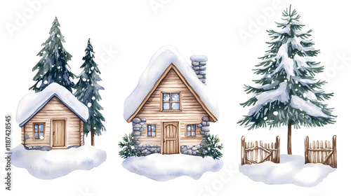 watercolor, winter, countryside, house, set, hand, drawn, tiny, triangle, cabin, wood, bungalow, stone, fence, gate, snowy, fir, tree, snowdrift, illustration, isolated, white, background, christmas, design, illustration