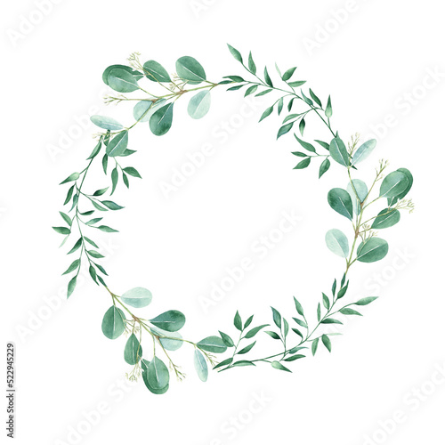Watercolor wreath isolated on white background. Rustic greenery, pistachio and eucalyptus branches.