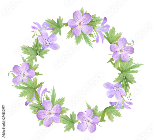 Watercolor wreath of lilac geranium flowers isolated on white background. Perfect for web design, cosmetics design, package, textile