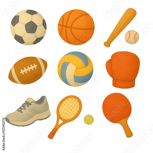 sport, ball, soccer, basketball, baseball, volleyball, tennis, football, boxing, shoe, racket, bat, ping pong, glove, fitness, activity, equipment, icon, game, athletic, competition, exercise, watercolor, illustration, colourful, training, cartoon, design, activewear, hand-drawn, gym, match, active, symbol, doodle, play, running, tool, fun, object
