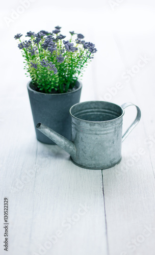 watering, can, flower, garden, gardening, flower, plant, nature, botany, botanical, blooming, beauty, horticulture, natural, floral, white, wooden, table