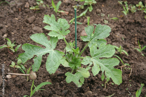Watermelon plant growing in the vegetable garden in summer. Citrullus lanatus