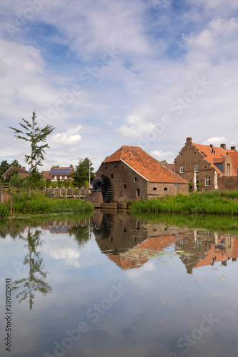 watermill, river, brook, water, building, historical building, holland, holland, nature, landscape, scenery, scenic, tree, blue, sky, cloud, cloudy, orange, roof, old, energy