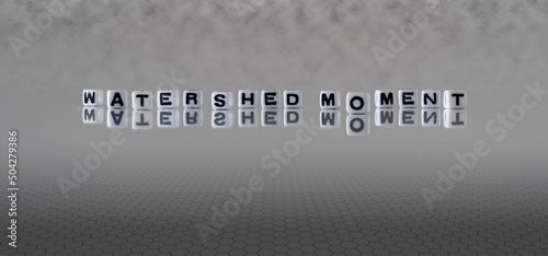 watershed moment word or concept represented by black and white letter cubes on a grey horizon background stretching to infinity