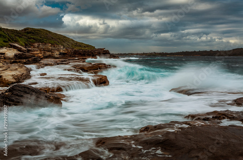 wave, weather, ocean, storm, rain, moody, seascape, landscape, swell, rock, shore, coast, sydney, cloud, sky, water, motion, flowing, cool, nature, awe, australia, place, erosion, new south wales
