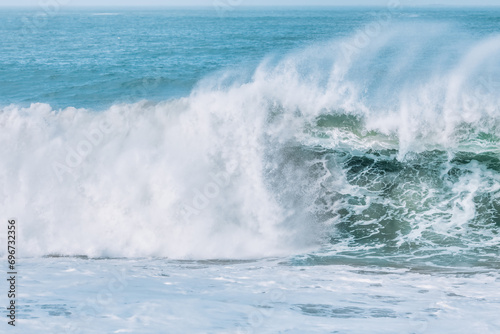 Wave splashes close-up. Crystal clear sea water hitting rock formations in the ocean in San Francisco Bay, blue water, pastel colors.