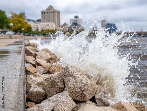 wave, splash, rock, water, river, coast, shore, sea, ocean, nature, spray, foam, tide, wet, stone, granite, river bank, waterfront, city landscape, urban, shoreline, crashing waves, high tide, water droplets, dynamic, powerful, energy, fluid, motion, liquid, aquatic, seascape, stormy, weather, cloudy, erosion, embankment, protection, autumn, tree, building, blurred background, tranquil, scenic