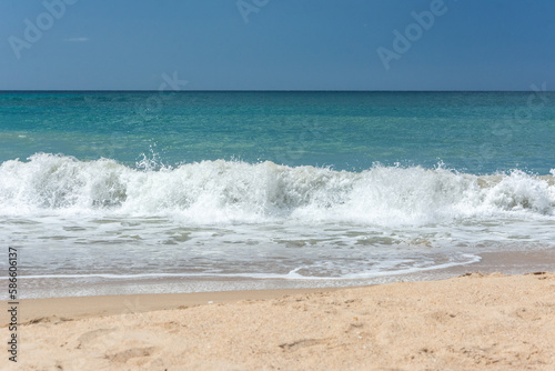 Waves crashing on the seashore. Blue sea. Foamy waves. waves for surfing tropical beach
