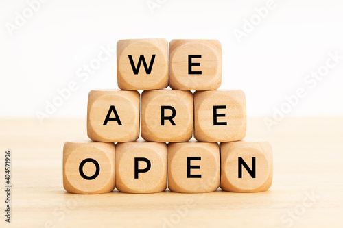 we, are, open, copy space, concept, opening, business, background, signs, text, message, service, information, symbol, nobody, wood, communication, conceptual, client, white background, dice, wooden, table, announcement