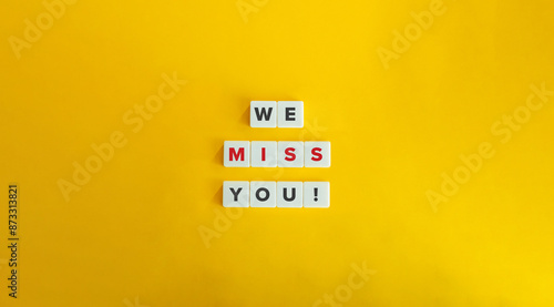 We Miss You Phrase and Marketing Strategic Tool or Tactic for Re-engaging with Customers. Text on Block Letter Tiles on Yellow Orange Background.