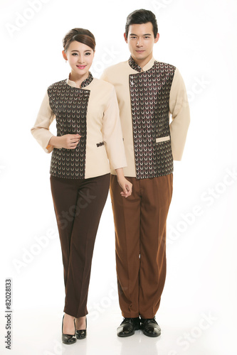 Wear clothing occupation Chinese waiters in white background