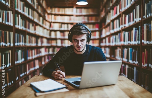 Wearing headphones while doing a college project and watching lectures on his laptop, smart black student guy studying in the library