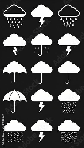 weather, icon, rain, storm, cloud, lightning, umbrella, weather forecast, meteorology, graphic, design, symbol, illustration, set, collection, element, clip art, pictogram, app, website, interface, design element, digital, white, black, background, simple, minimal, vector, flat, rainy, thunderstorm, precipitation, climate, retail, scenery