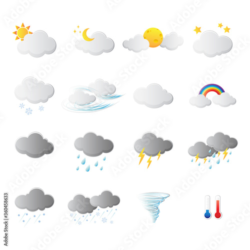 cloud, weather, sky, meteorology, icon, sun, snow, rain, nature, symbol, cloud, moon, climate, thunder, lightning, cartoon, summer, rainbow, thermometer, hurricane, star, cloudy, temperature, wind, snowflake, storm, forecast, day, set, night, cold, white background, vector, illustration
