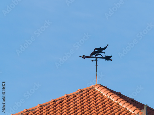 weather vane shaped like tree dolphins placed on top of a roof made of terracotta tiles