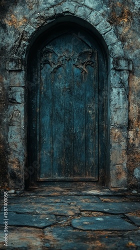 door, doorway, entrance, portal, building, structure, old, ancient, weathered, rustic, wooden, stone, dark, arched, gothic, intricate, textured, mediaeval, fantasy, vintage, closed, blue, dark blue, teal, grey, brown, earthy, muted, mysterious, eerie, solemn, secret, forgotten, magic, historical, timeless, solitude, exterior, wall, pathway, castle, architectural, vertical, detailed, classic, soft light, background, adventure