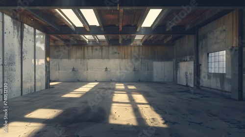 Weathered facility of abandoned industrial building of plant with rusty metal ceiling and shabby concrete floor : Generative AI