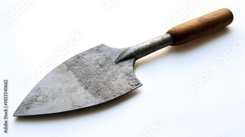 trowel, garden tool, horticulture, agriculture, farming, gardening, landscaping, planting, digging, dirtied, earth, metal, wood, handle, white background, isolated, closeup, macro, tool, instrument, equipment, technology, digital, marketing
