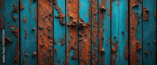 Weathered turquoise wood texture with rust and peeling paint showcasing vintage charm and rustic aesthetic for design backgrounds.