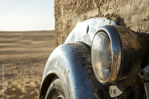 vintage car, classic car, headlamp, desert, sand, abandoned, weathered, rust-eaten, old car, automobile, vehicle, transportation, travel, adventure, retro, classic, nostalgic, sunlight, texture, grunge, metal, chrome, wheel, tire, fender, damage, decay, worn, desert landscape, sahara, africa, arid, dry, sun, shadow, dust, dirt, background, detail, closeup
