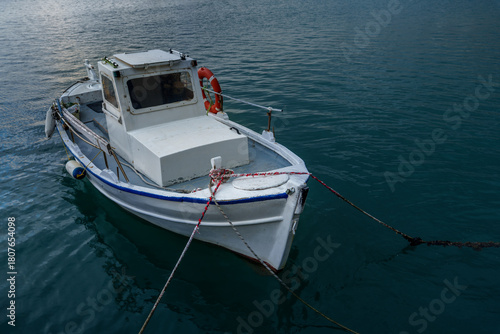 anchored, cabin, calm sea, coastal, daytime, fishing boat, harbor, lifebuoy, marina, marin, moored, nautical, ripple, seascape, simple, small boat, traditional, tranquil, travel, watercraft