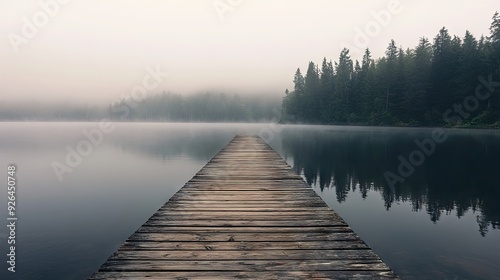 Weathered Wooden Pier Extending into a Foggy Lake with Calm Waters and Dense Forest Barely Visible in the Distance. AI generated illustration