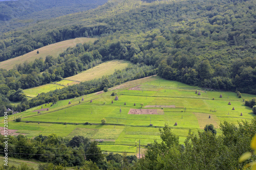 weathering of hay, haystacks in the field. idyllic country landscapes on a sunny day. beautiful rural landscape of the Carpathian mountains