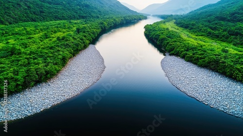 Weathering process concept. A serene aerial view of a winding river surrounded by lush green landscapes.