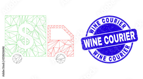 Web carcass banking delivery pictogram and Wine Courier stamp. Blue vector rounded distress stamp with Wine Courier phrase.